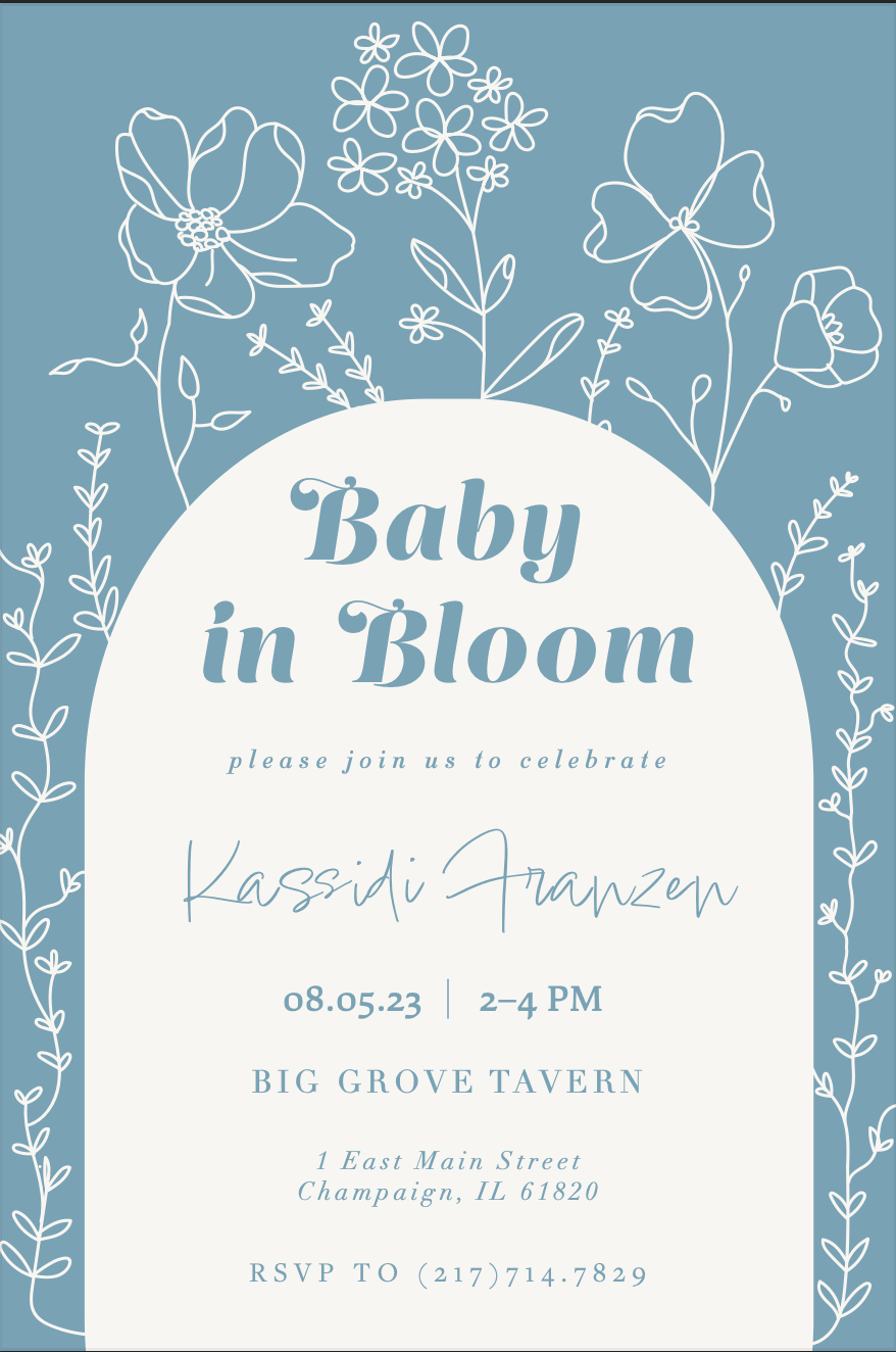 The objective of this project was to design an elegant and inviting baby shower invitation for Kassidi Franzen. The design needed to reflect a warm and celebratory tone, aligning with the "Baby in Bloom" theme, and include all key event details in a clean and easy-to-read format.
