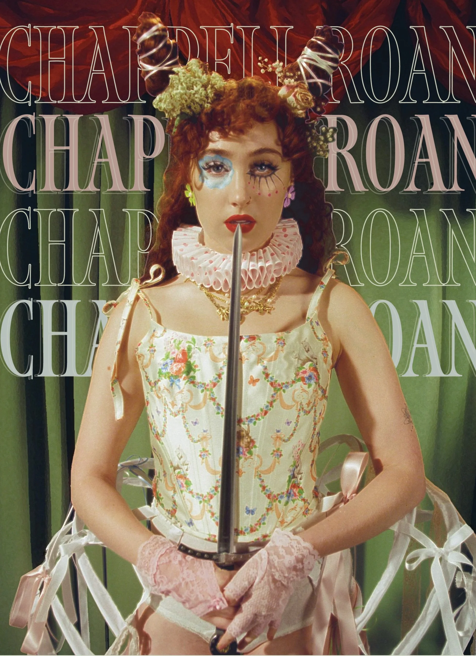 The design draws inspiration from vintage carnival and Rococo influences, blending classic elegance with a hint of rebellious edge. The character portrayed is both delicate and daring, holding a sword with a gaze that challenges the viewer, embodying Chappell Roan's eclectic and empowered artistry. The costume’s ornate details and pastel palette evoke an 18th-century aesthetic, while modern typography and layered text effects add a contemporary twist.
