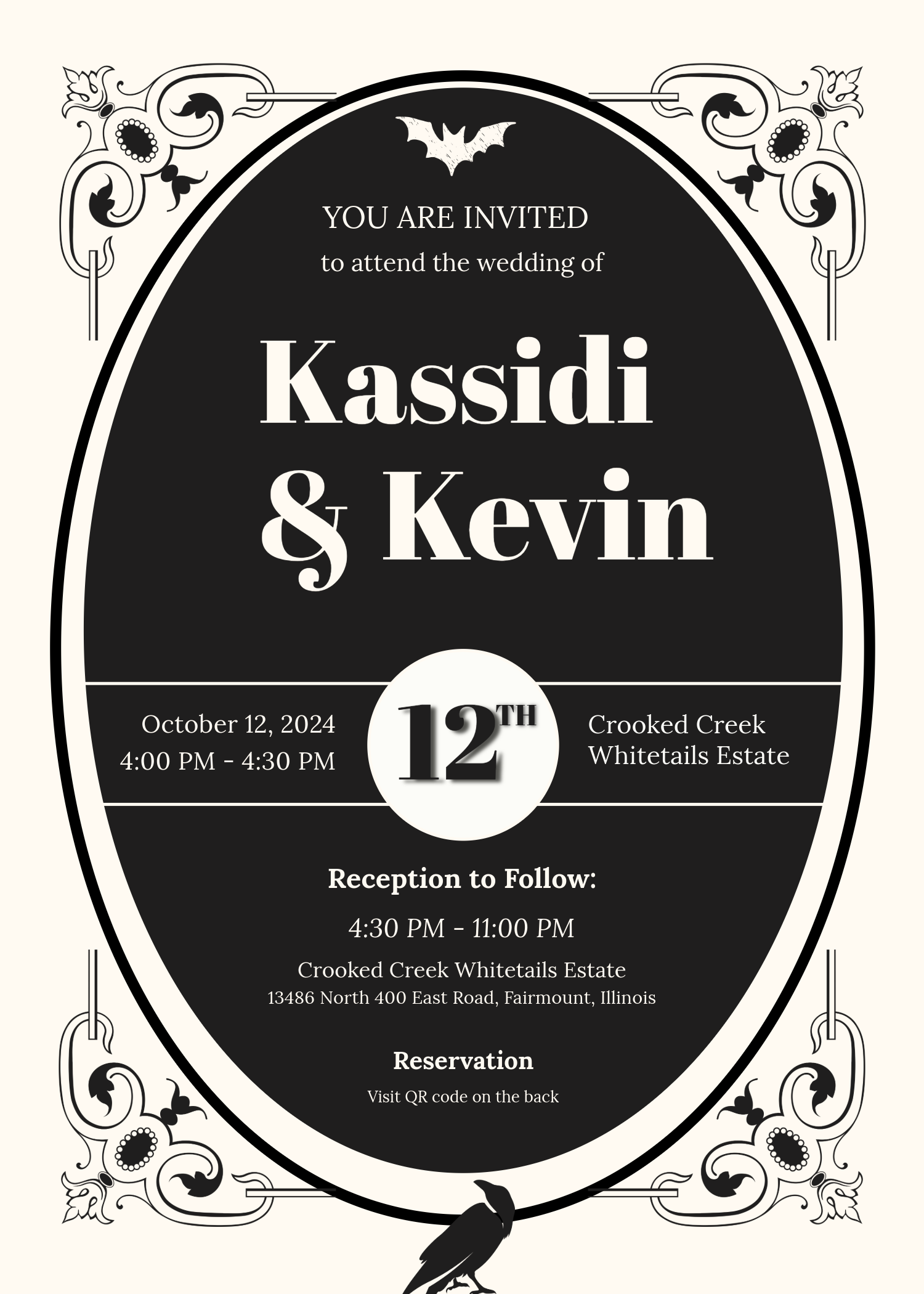 This project captures the spirit of Kassidi and Kevin's Halloween-inspired "‘Til Death" theme while maintaining the sophistication expected of a wedding invitation. It stands as a testament to the couple’s personality and their love for all things eerie and elegant. The design invites guests into a celebration that’s both hauntingly beautiful and deeply personal.