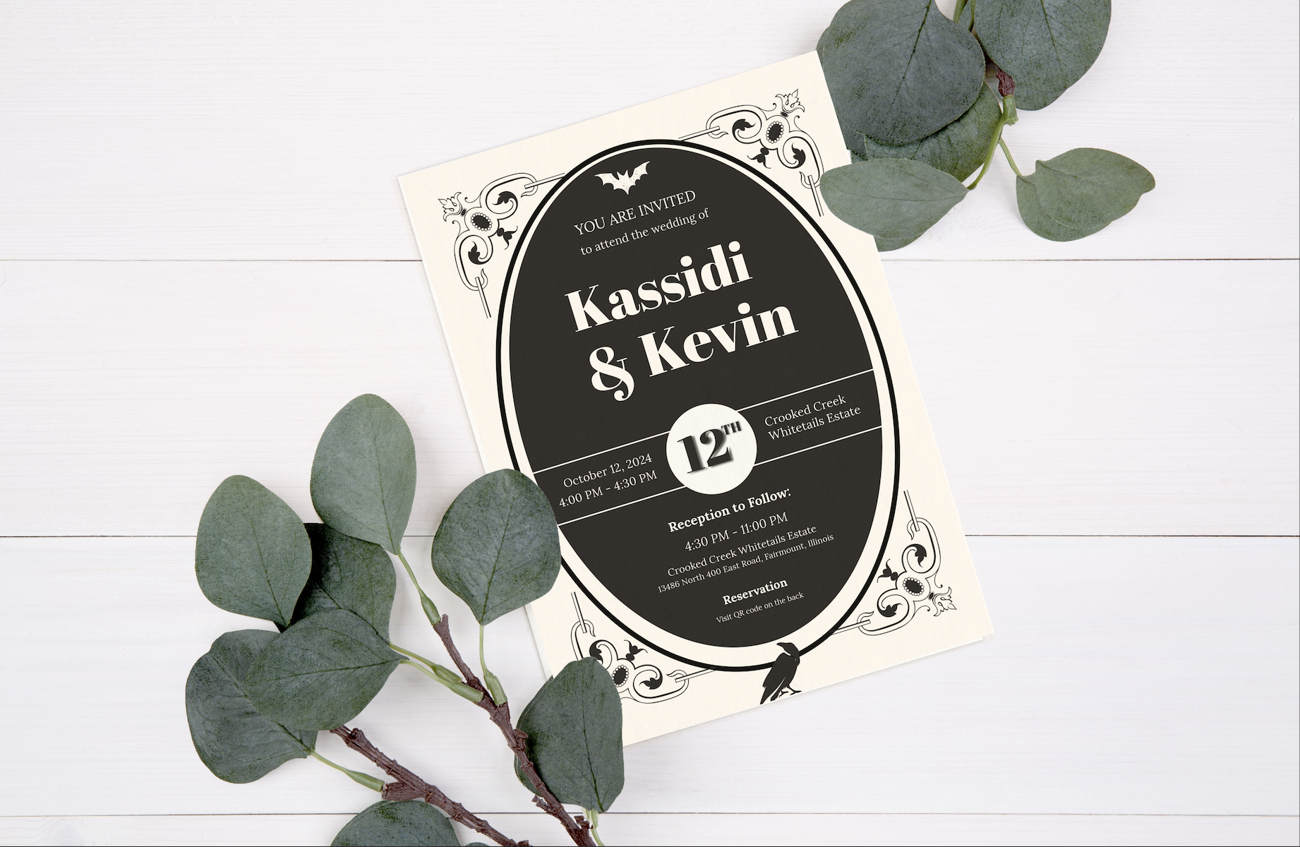 Imagery: Gothic-inspired embellishments, including bats, ravens, and spiderwebs, which frame the invitation and set the tone for a Halloween-inspired wedding.